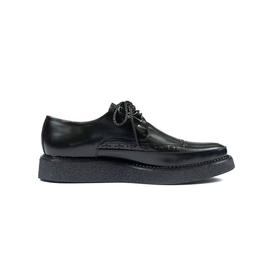The Hawkins are classic creepers with old school style. Premium black leather upper with original stitching pattern. Custom soles have an ideal almond toe shape and STH logo engraving. Unisex sizing.